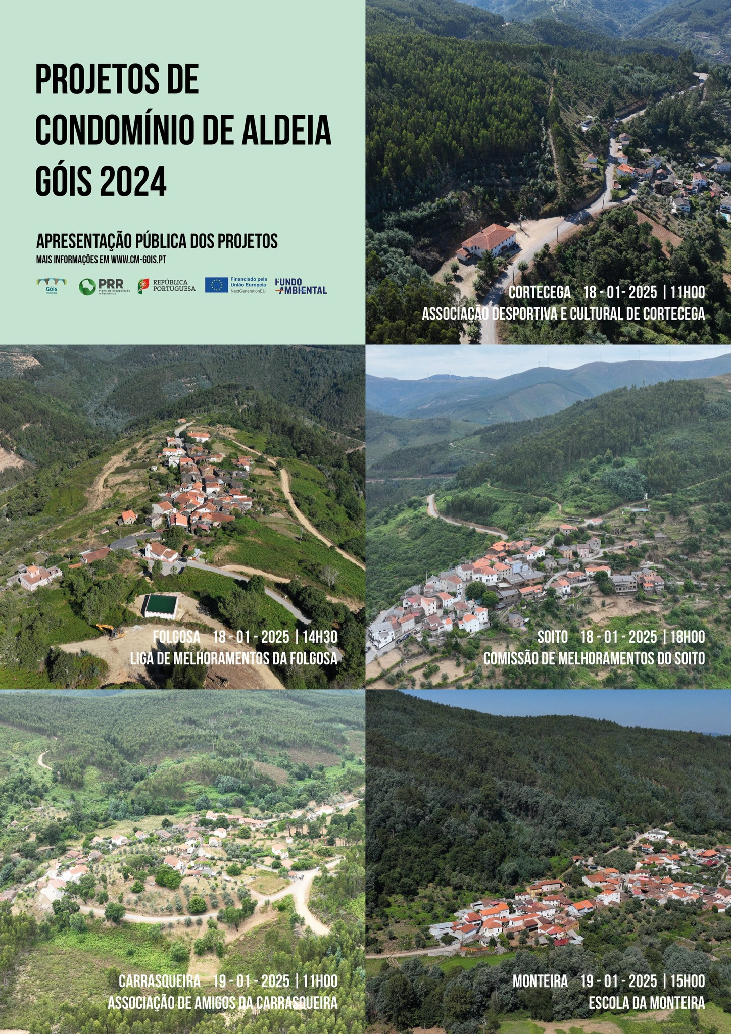 No dia 18 de janeiro, as apresentações começam na Freguesia de Góis, com sessões às 11h00 na Associação Desportiva e Cultural de Cortecega e às 14h30 na Liga de Melhoramentos da Folgosa. Às 18h00, será a vez da União de Freguesias de Cadafaz e Colmeal, com a apresentação na Comissão de Melhoramentos do Soito. Já no dia 19 de janeiro, as ações continuam na Freguesia de Alvares, às 11h00, na Associação de Amigos da Carrasqueira, e na Freguesia de Vila Nova do Ceira, às 15h00, na Escola da Monteira. Estas sessões são uma oportunidade para as comunidades conhecerem e participarem na construção de um futuro mais resiliente e sustentável.