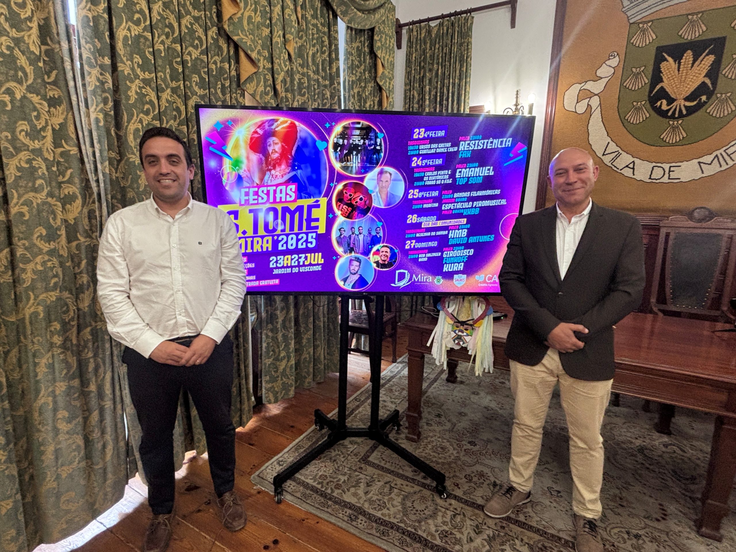 O programa das Festas de São Tomé 2025 foi hoje oficialmente apresentado no Salão Nobre da Câmara Municipal de Mira, numa sessão conduzida pelo Presidente da Câmara, Artur Fresco, e pelo Vereador da Cultura e Eventos, Tiago Cruz. Esta é uma celebração profundamente enraizada na identidade cultural, social e religiosa do concelho, que atrai anualmente milhares de visitantes.