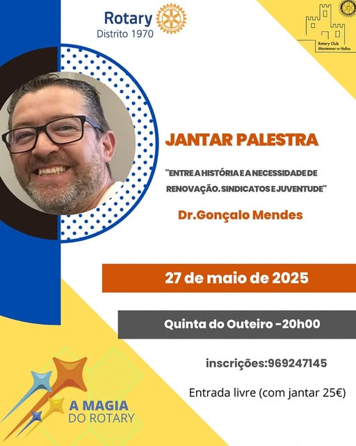 O Rotary Club de Montemor-o-Velho realiza dia 27 de Maio de 2025, pelas 20 horas, na Quinta do Outeiro, um jantar palestra, sendo esta a cargo do Doutor Gonçalo Mendes, com a temática “Entre a história e a necessidade de renovação. Sindicatos e juventude”.
