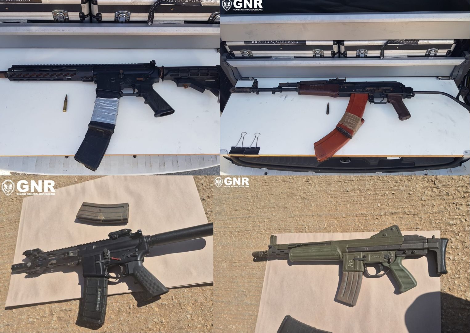 Perante indícios de transbordo em curso, a UCCF acionou os meios operacionais necessários, intercetando os suspeitos e neutralizando a ocorrência. Foram apreendidas quatro espingardas automáticas – uma AK-47, uma M4, uma CETME-L e uma adaptada dos modelos AR-15/M4 –, bem como carregadores com 106 munições e três veículos.