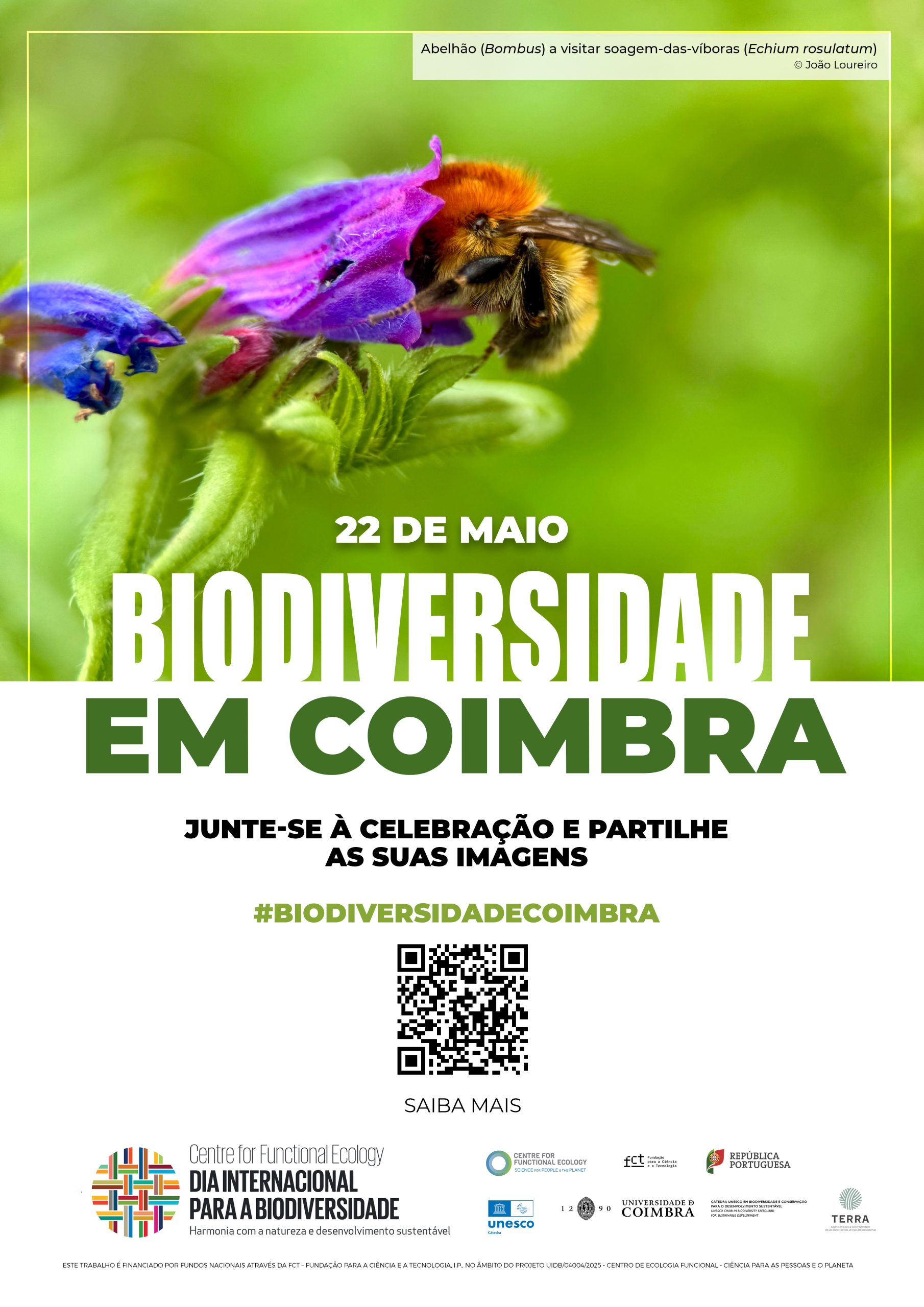 A Universidade de Coimbra vai assinalar o Dia Internacional da Biodiversidade, a 22 de maio, com uma campanha de sensibilização pela cidade de Coimbra. A iniciativa é promovida pelo Centre for Functional Ecology (CFE) da Faculdade de Ciências e Tecnologia (FCTUC) e pela Cátedra UNESCO Biodiversidade e Conservação para o Desenvolvimento Sustentável.