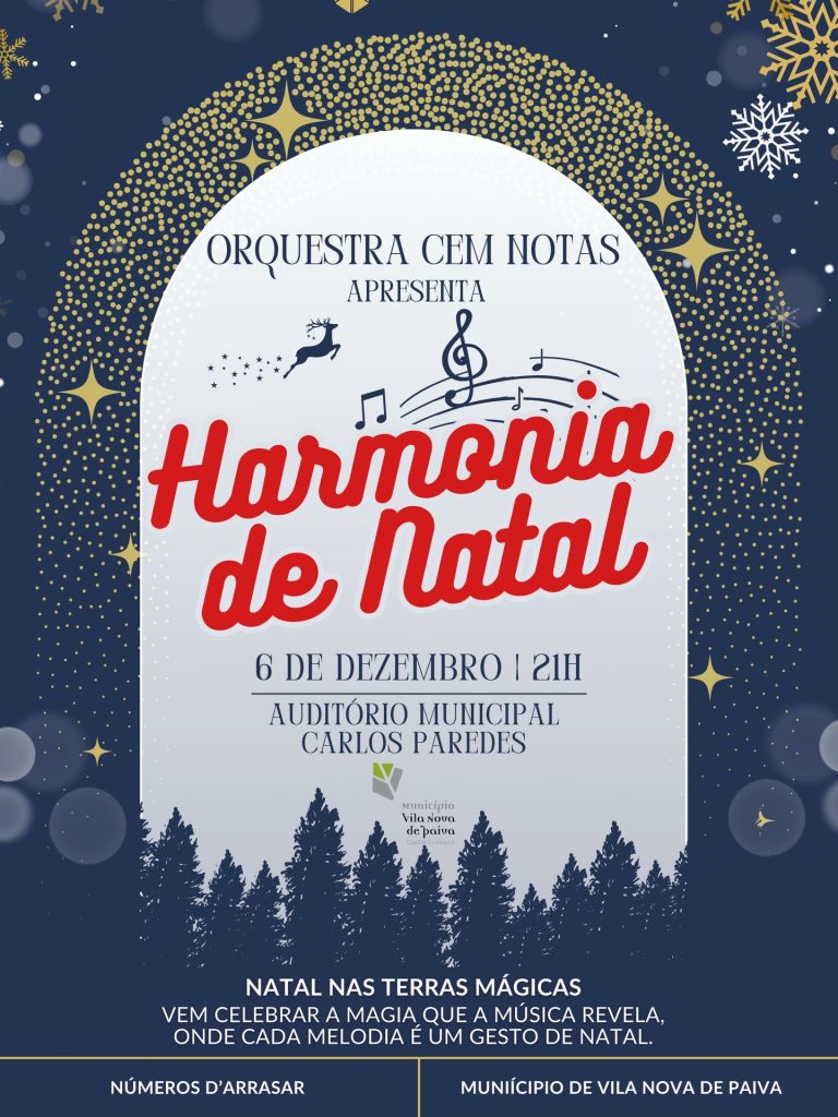 No dia 6 de dezembro, às 21h, o Auditório Municipal Carlos Paredes, em Vila Nova de Paiva, vai acolher o concerto especial “Harmonia de Natal”. A iniciativa é promovida pela Orquestra Cem Notas, em parceria com o Centro de Estudos Números d’Arrasar.