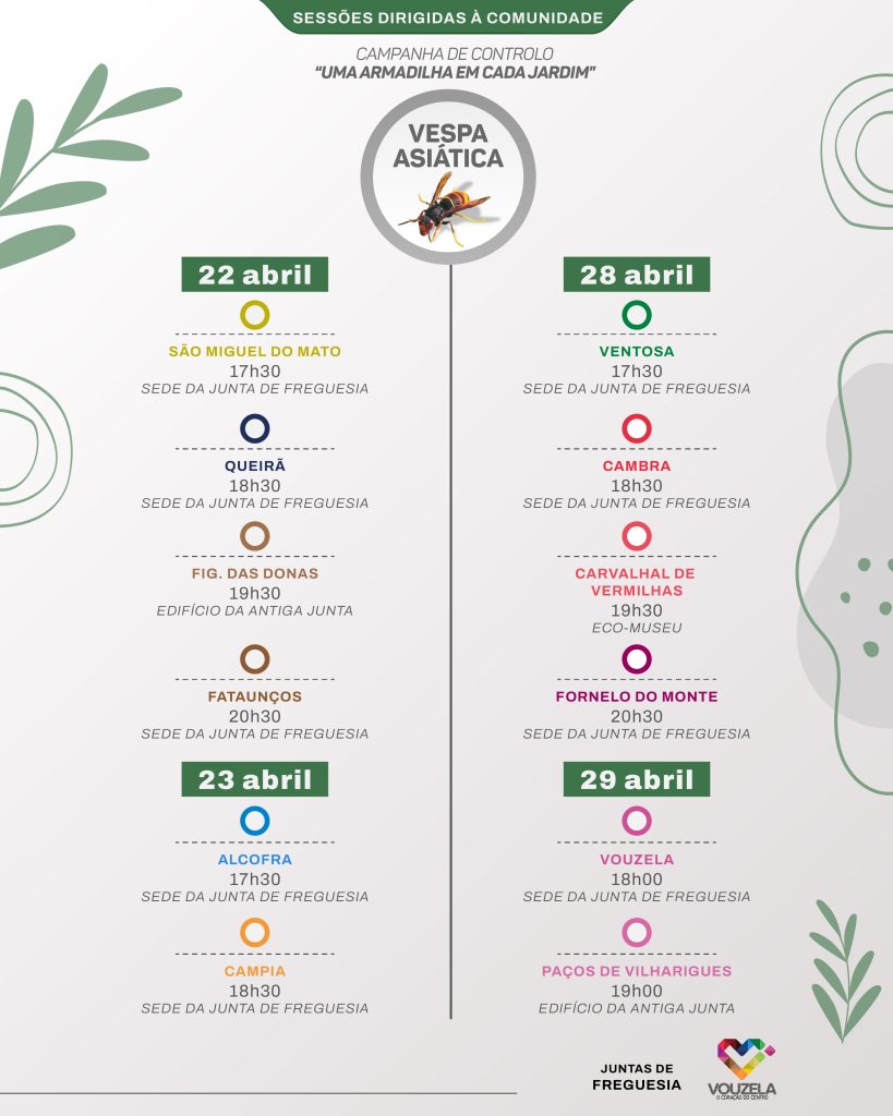 O Município de Vouzela vai dinamizar, nos dias 22, 23, 28 e 29 de abril, uma ação de sensibilização sobre a vespa velutina, também conhecida como vespa asiática. A iniciativa, intitulada “Uma armadilha em cada jardim”, irá percorrer todas as freguesias do concelho, com o objetivo de informar e envolver a população no combate a esta espécie invasora.